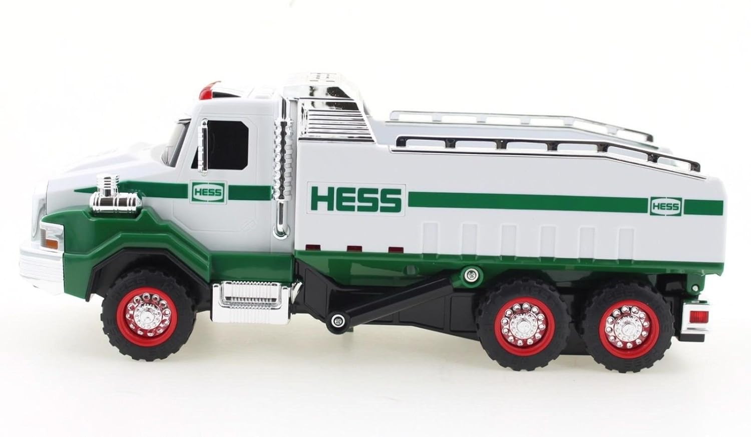 2017 Hess Dump Truck and Loader is a powerful partnership of heavy-duty earth movers. With over 30 brilliant LED lights plus realistic sounds, this oversized dump truck and 2-way motorized, track-driven loader are a versatile team, ready to tackle the toughest jobs. The first ever Hess Dump Truck is boldly designed with a solid green base, white upper body, and green side stripes. The elongated hauling bed, on a dual-axle rear chassis, is custom-designed as a transport for its work partner, with an innovative fold-down tailgate that is also a hidden pull-out ramp for the Loader to drive right up into position. A cab-mounted button activates the hydraulic lift pistons (and associated sound), raising the bed into the dumping position. 4 additional buttons trigger 3 more sounds (ignition, horn and backup) and flashes all of the brilliant lights. Chrome detailing includes front grille and bumpers, sun shield, cab steps, grab rails, and exhaust pipes The self-propelled, multi-direction powered Loader has a 270 degree rotating cab with a side-mounted extending boom featuring a jointed excavator arm and bucket combination that can bend and swivel in just about any direction. 2 top-mounted switches activate the lights and the motorized tracks in either forward or reverse direction for ultimate maneuverability. Chrome accents include the exhaust pipes, side mirrors and grille. Totaling 350 parts and measuring approximately 12 inches long, this construction duo is the heaviest and most complex Hess Toy Truck ever.