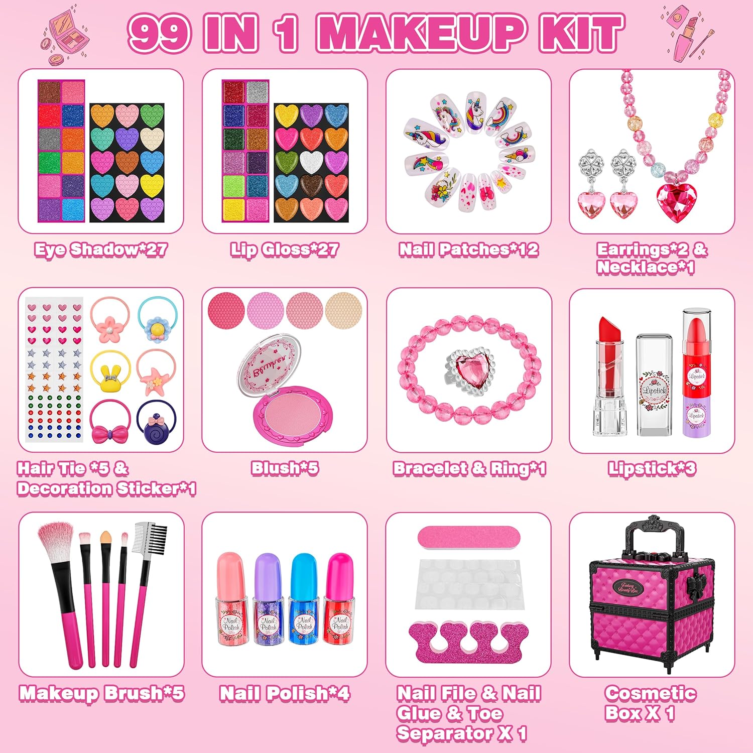 Complete 99-Piece Makeup Kit: This all-in-one Makeup set includes everything she needs to create her own princess look—including 27 eye shadow,27 lip gloss,12 Nail Patches,2 Earrings,1 necklace,6 hair tie;1 decoration sticker;5 blush,1 Bracelet and ring,3 lipstick,5 Makeup brush,4 nail polish;1 nail file ,1 toe separator,1 nail glue,1 cosmetic box. The ultimate kit for hours of fun and endless possibilities!