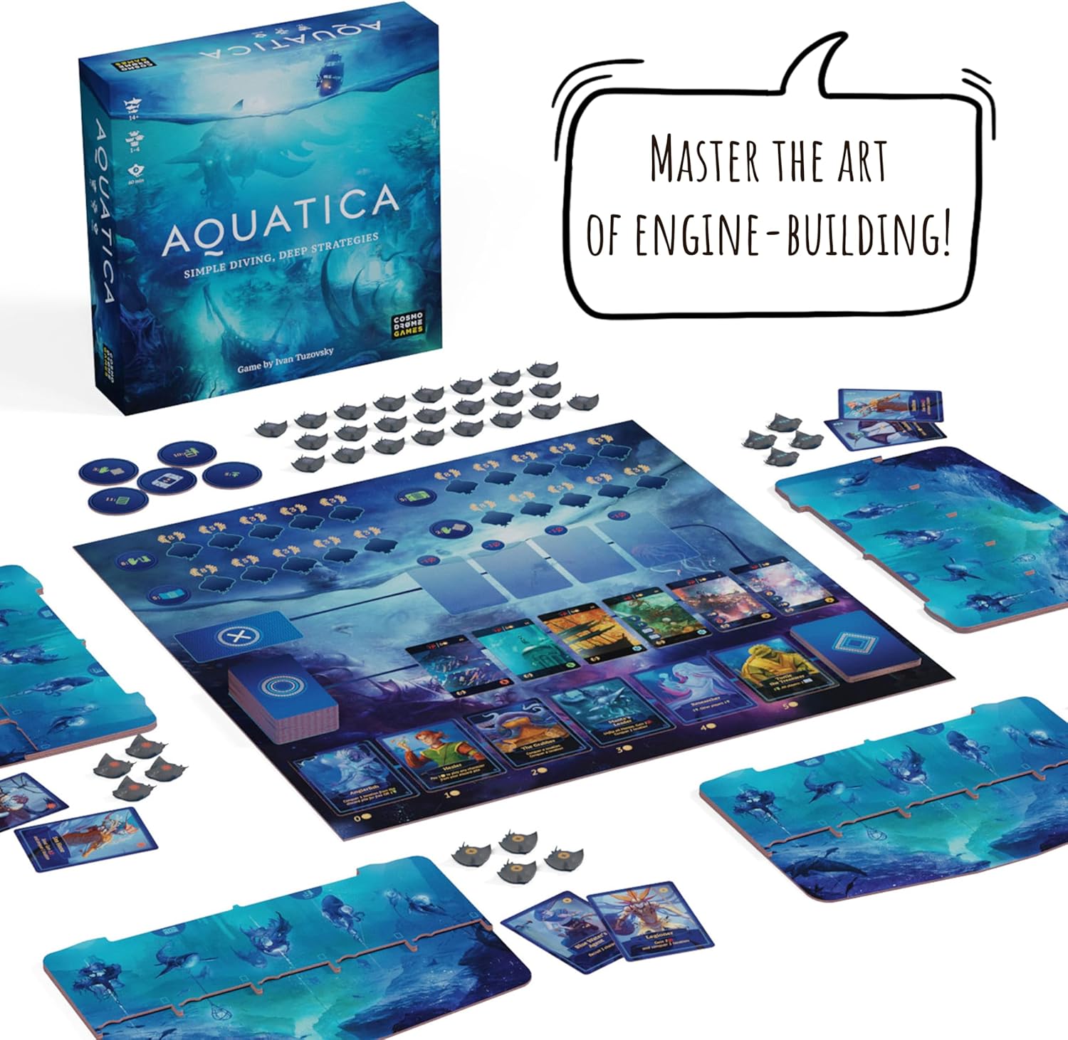 Aquatica suits 1-4 players (14+), 60 mins per game, great for 2-player, kids, and family game nights.