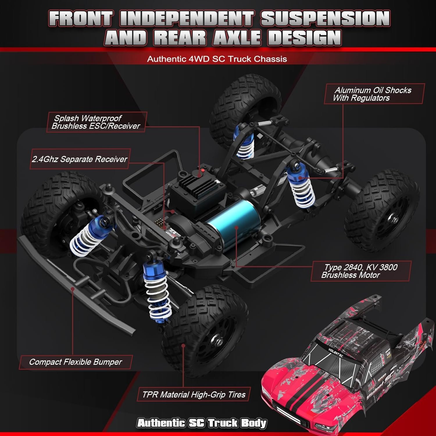 【Versatile Off-road Performance】This fast rc car features a traditional short-course truck structural design with front independent suspension and rear axle. The steering system features the adjustable steering link and a efficient agile 3-wire 17g servo. The rear shocks are mounted on the rear axle which effectively enhances suspension travel and help the remote control car to overcome toughest terrains. The anti-roll sway bar prevents the rc truck from slipping over due to abrupt steering.