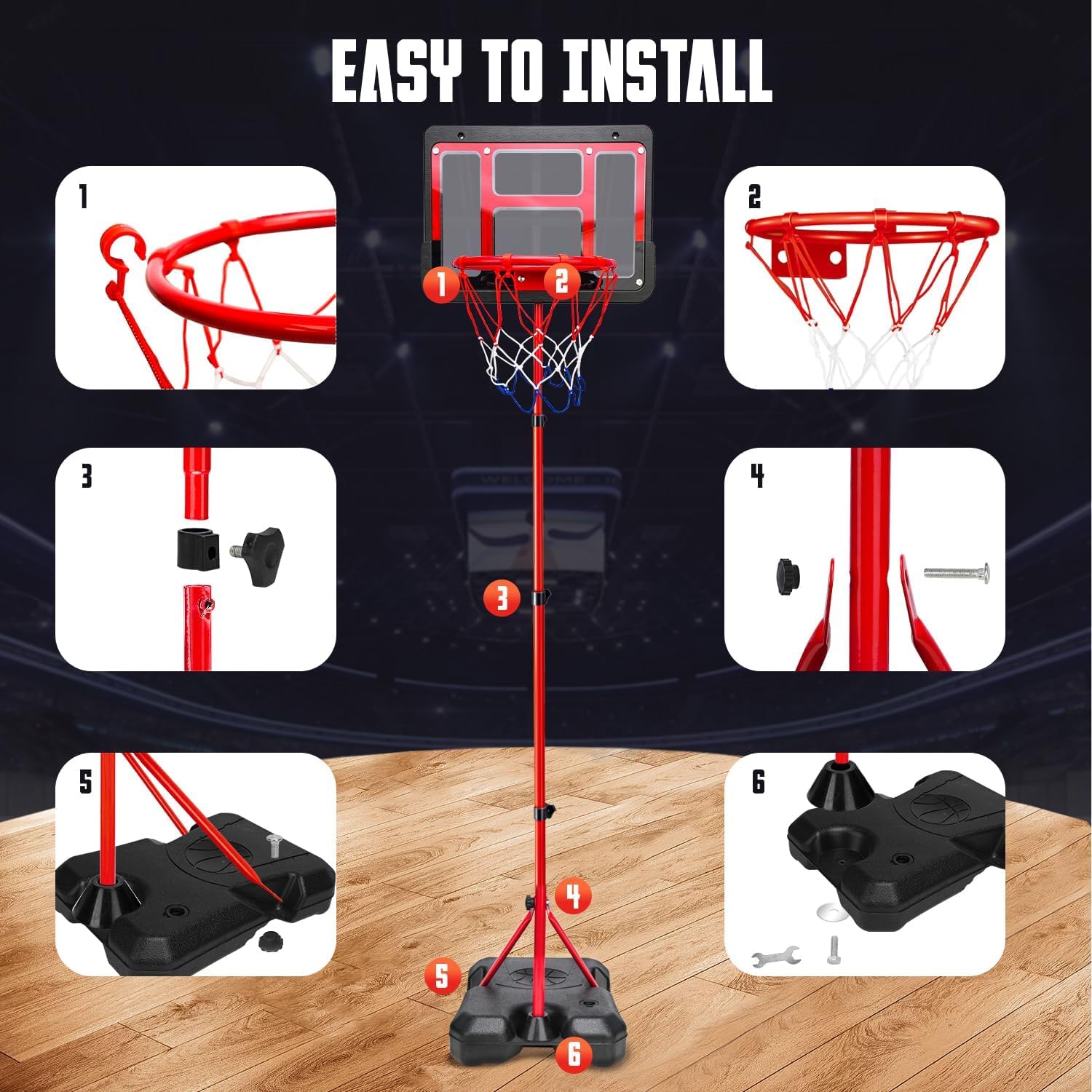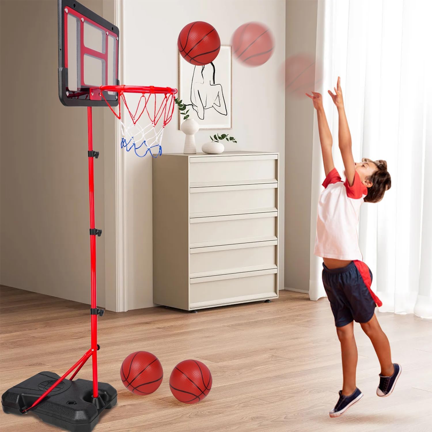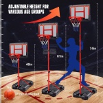 KID BASKETBALL HOOP DELIGHT: This toddler basketball hoop is a complete set equipped with a backboard, three basketballs, an inflatable pump, rim, net, and a sturdy base among other essentials. It’s super easy to put together with the help of the included instructions. Featuring height adjustability from 46 to 74 inches, this hoop grows with your child, making it perfect for kids aged 3-8.