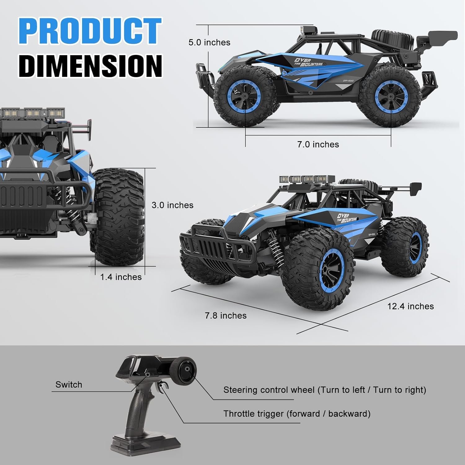 【High Speed and Sensitive Control】This 1/12 scale RC monster truck can reach up to 20km/h (equipped with 280 motors), adopts 2.4GHz non-delayed remote control (50 meters control distance), responsive and multi-vehicle play without interfering with each other, so you and your kids can enjoy indoor and outdoor speeding fun and experience the ultimate off-road!