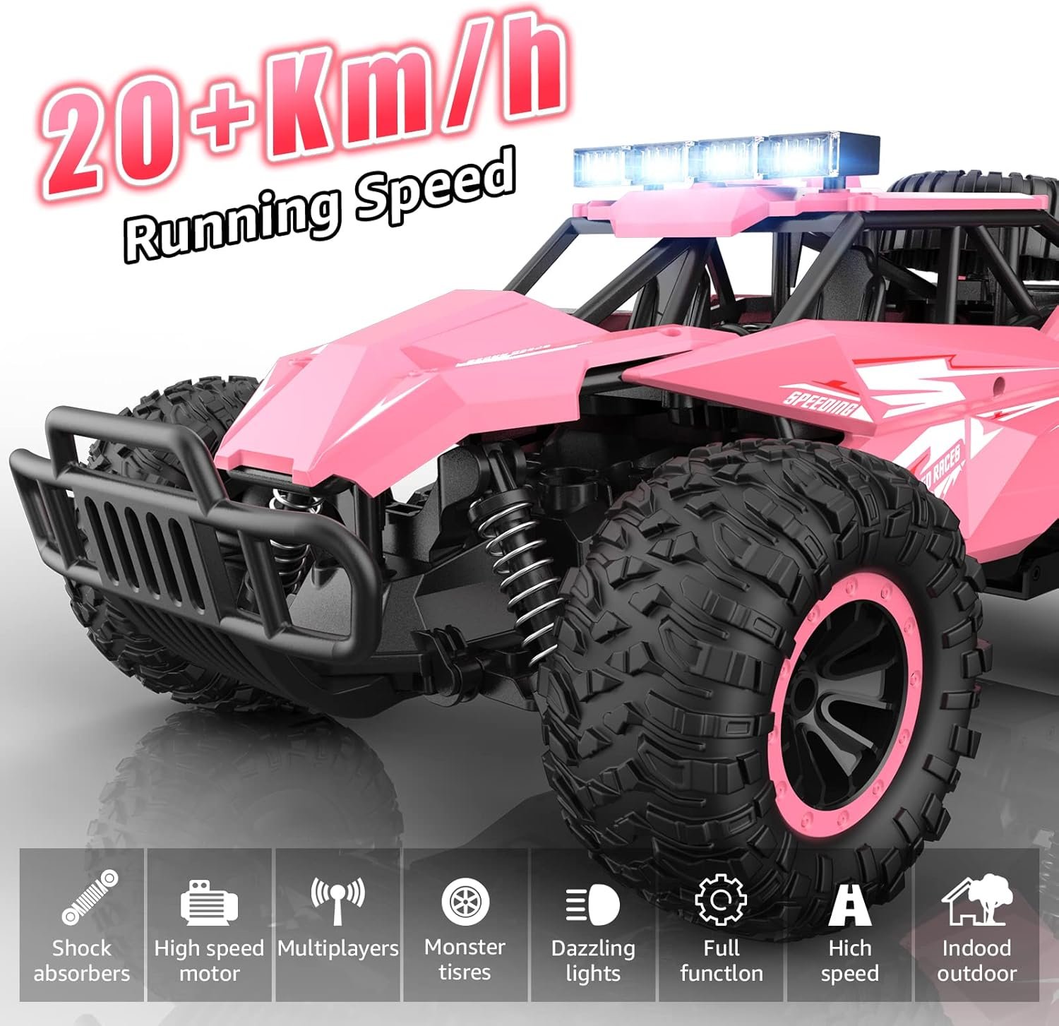 【Cool Chassis Lights and Headlights】Flashing lights make this remote control monster truck unique and different. If you have a pet dog, you can operate the remote control car to attract its attention and let it run and play with you. If your child is small, this can also attract his attention and cultivate his interest. This rc cars is a fun gift that will bring joy to children and pets.