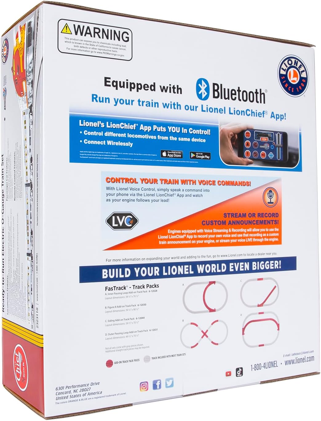 OPERATION TECHNOLOGY: Operation Technology via the Lionel LionChief App includes Bluetooth 5.0 that allows you to operate your train via any compatible smart device / (LVC) allows you to run your locomotive by speaking commands / (VSR) records your own voice to generate custom train announcements, or streams your voice live through the engine / RailSounds RC Sound System controls train sounds and announcements / FasTrack System snaps together for tight, reliable connections