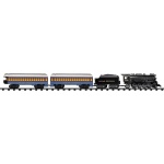 TRAIN SET FEATURES – Battery-powered Berkshire-style locomotive; Authentic train sounds and announcements, including a whistle; Working headlight; Detailed passenger coach, fixed knuckle couplers; User-friendly remote control