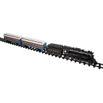 SET INCLUDES – Battery-powered steam locomotive and tender; Passenger-coach; Observation car, 24 curved and 8 straight plastic track pieces; Remote control