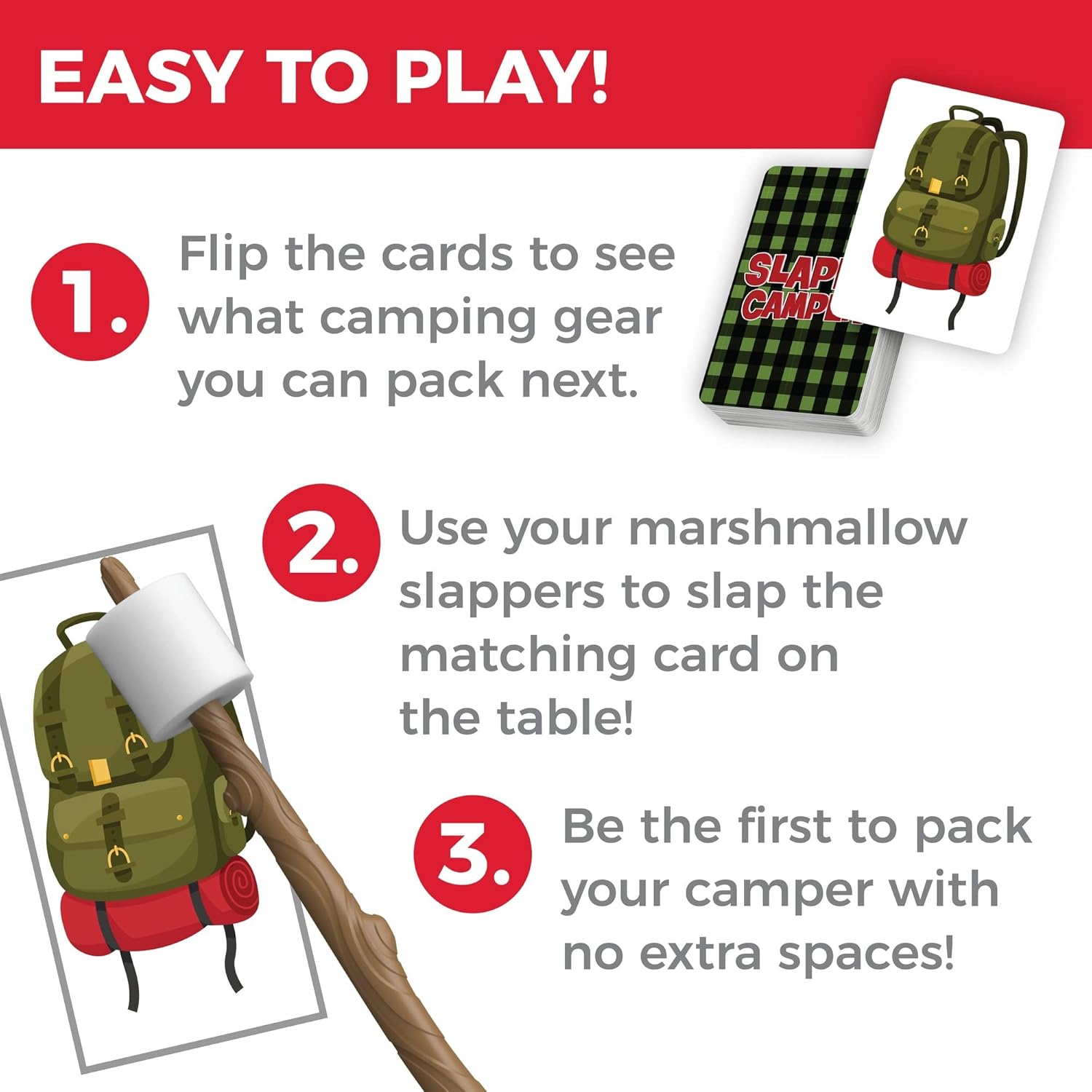 Fast and Fun: Race to pack up your camper! You must think on your toes to slap the right camping gear; but watch out – slap the wrong card and you may find yourself unpacking!