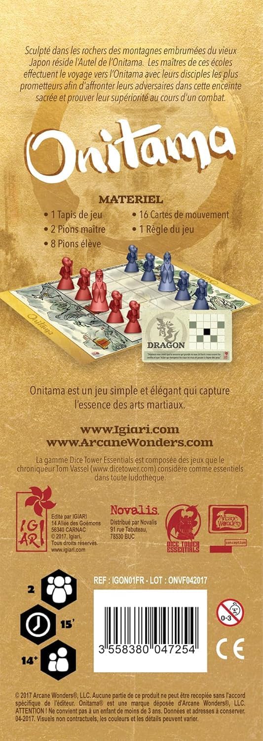 Onitama is a two player abstract strategy game where players take on the role of a Master, guiding their monk followers, attempting to defeat your opponent armed only with a handful of moves, your cunning and your wits.