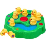 This wacky, quacky memory and matching game combines developmental skills for young children with the fun of a “My First Game,” helping kids with shape recognition and colors. Switch on the circular pond, and the ducks start swimming – the bottom side of each duck has a colored shape. Players take turns picking up a duck and looking at the color and shape; if it matches their colored shape, they get to keep the duck. If it doesn’t match, they put it back. The ducks continue to swim, so it’s more challenging than a traditional memory game but easy enough for even the youngest duck lovers to play. The first player with 3 ducks that match their shape wins! Requires 2 AA batteries (not included). For 2-4 players, ages 3 and up. Includes a fun Pop the Pig Make-A-Match Card Game!