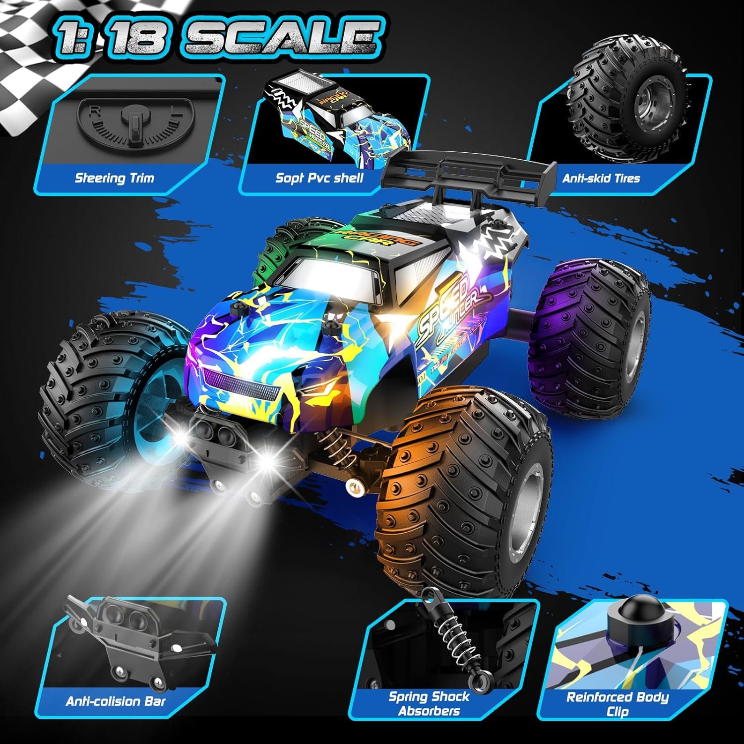 Cool LED Lights – Light Up Every Racing Adventure: This remote control car features dazzling front headlights and vibrant body lights that light up every race—day or night. Whether your child is racing indoors or tearing through the backyard, the bright LED lights improve visibility while adding futuristic flair to the fun. Crafted with flexible, sturdy PVC and a sturdy chassis, this rc car is built to withstand crashes, making it the perfect remote control truck for active kids