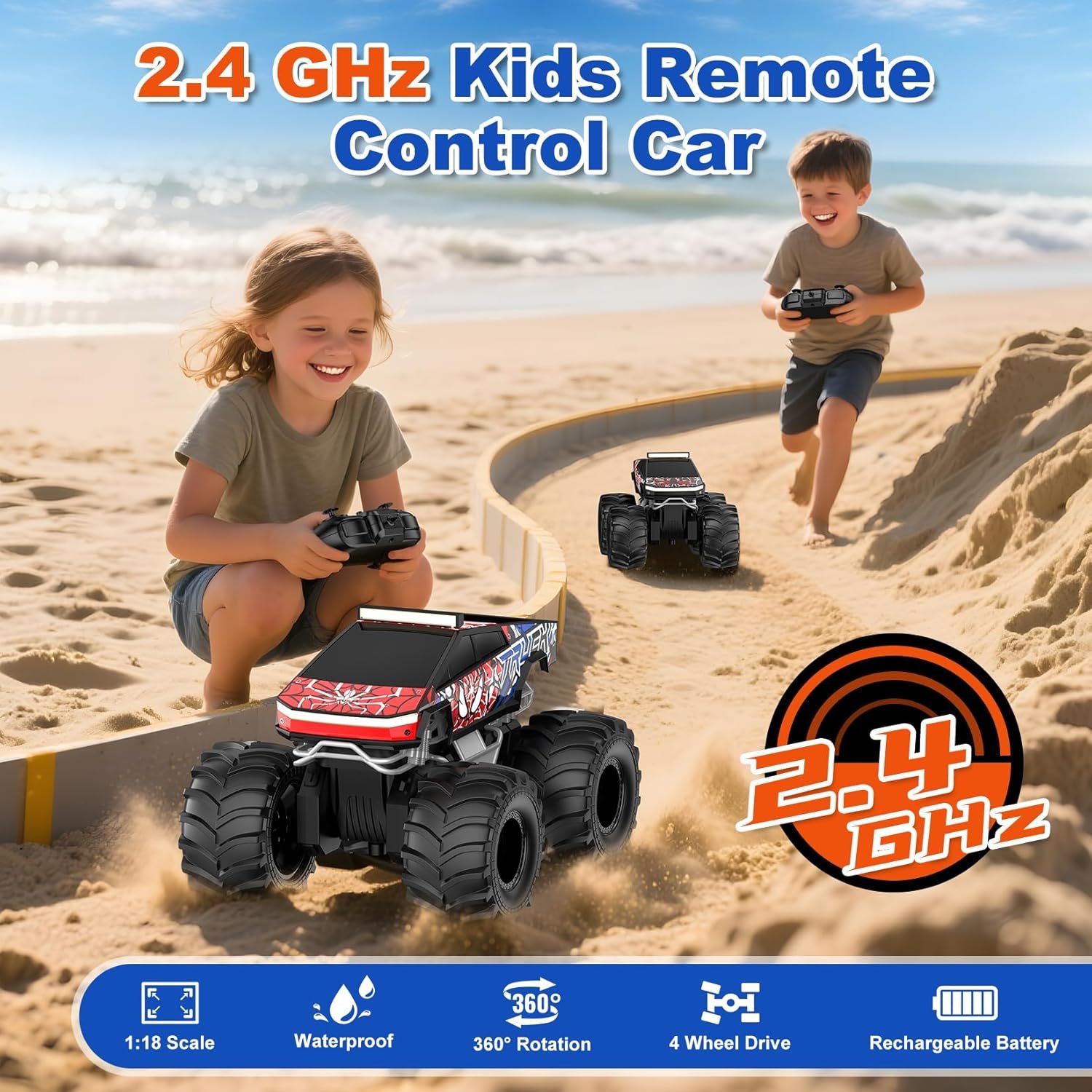 Amphibious Remote Control Car for Kids – This 1:18 scale rc trucks is built to race across land and water with ease. With waterproof construction, 4WD drive, 360° spins, LED lights, 2.4GHz wireless remote control is responsive, long-distance anti -interference No Chaos, easy to operate, allows multiple cars to race simultaneously, making it one of the popular monster truck toys and rc cars for kids