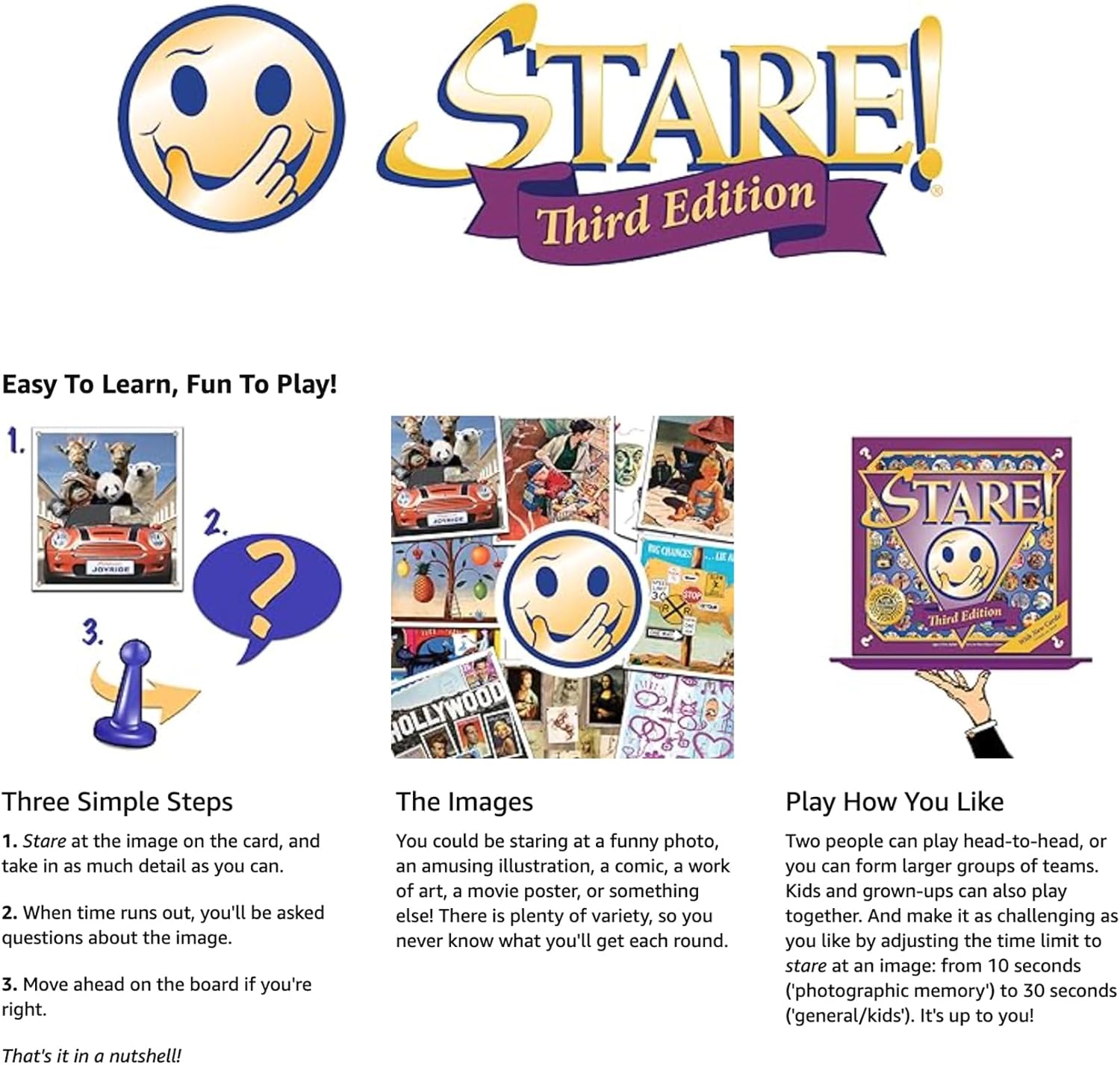 [A Quik Note: This edition of Stare! features a fresh collection of images and larger cards. Any mention of editions released prior to 2019 refers to out-of-print versions of the game. Look for the print date on the lower-left corner of the box.]