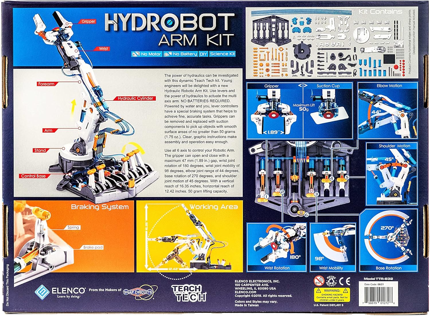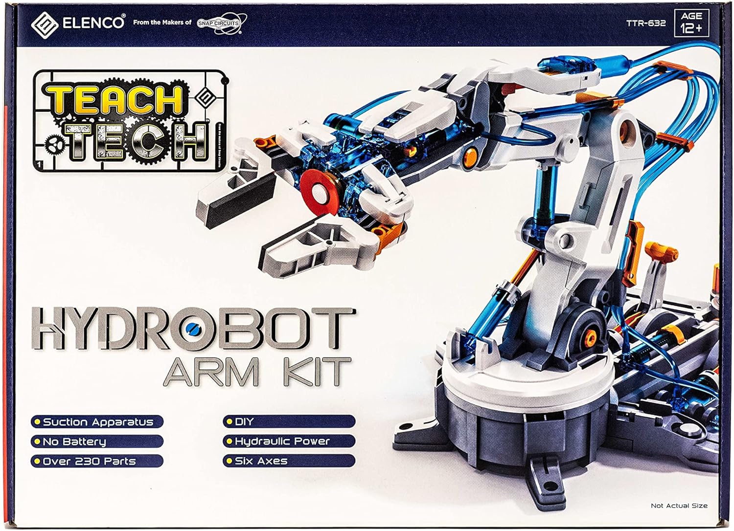 “Young engineers will be delighted with the new HydroBot Arm Kit. It is powered by water, so no motor needed! They can use the levers and the power of hydraulics to move the multi-axis arm. The lever controllers have a special braking system that helps to achieve fine, accurate tasks. The gripper can open and close with a maximum 47mm (1. 89 in. ) gap, wrist joint rotation of 180deg. , wrist joint mobility of 98deg. , elbow joint range of 44deg. , base rotation of 270deg. , and shoulder joint motion of 45deg. , with a vertical reach of 16. 35in. , horizontal reach of 12. 42in. , and 50g lifting capacity. Grippers can be removed and replaced with suction components to pick up objects with smooth surface areas of no greater than 50g (1. 75 oz. ). The clear, animated instructions make the assembly and operation of this STEM robot easy to understand. Best suited for Future Engineers 12 and up. Elenco Teach products are based on STEM activities (Science, Technology, Engineering, Math) to teach and encourage kids in their development, all while having fun! All Teach Tech Green-Energy robots are powered by either water, wind, or sun, so there are no batteries required. Perfect for future engineers ages 12+. “