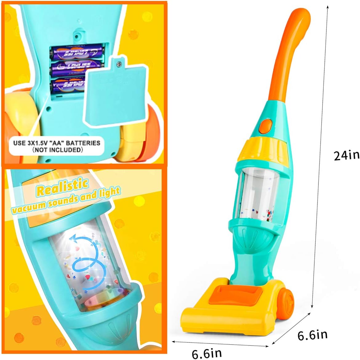 This kids vacuum cleaner toy dimensions: Height:24 in,Length:6.6 in,Width:6.6 in, adjustable angle design, which is just the right size for kids ages 3+ to grasp and handle easily