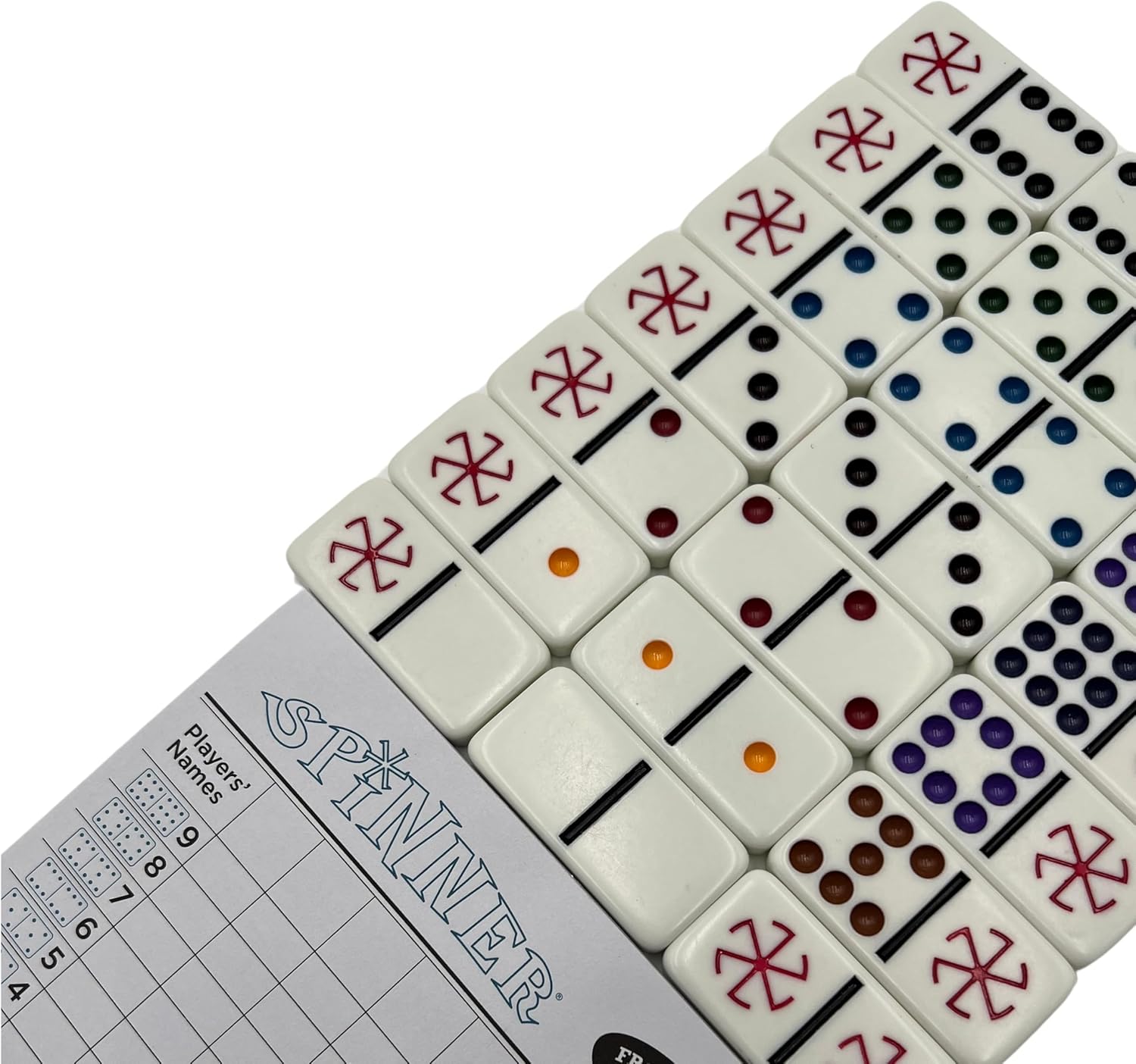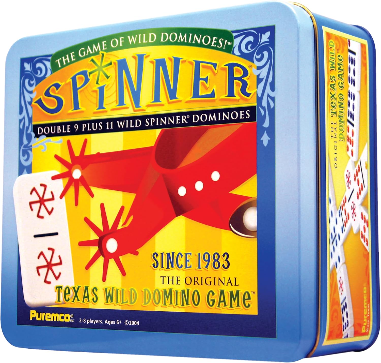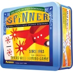 Sometimes when you’re playing dominoes, things can get a little wild! Spinner is the only dominoes game with wild dominoes that can be played as any number. A dynamic Double 9 Domino game plus 11 Spinner wild dominoes, Spinner is a great combination of other dominoes games, for a fun and exciting variation on traditional dominoes. An exciting and extremely popular game invented by Dr. & Mrs. Edna F. Graham of Abilene, Texas in 1983, Spinner has been exclusively manufactured and distributed for more than 30 years by Puremco Inc., which is now part of the University Games family. The set contains 55 standard size dominoes with colored dots and 11 extra Spinner dominoes emblazoned with the bold Spinner symbol, Spinner score pad, and instructions.